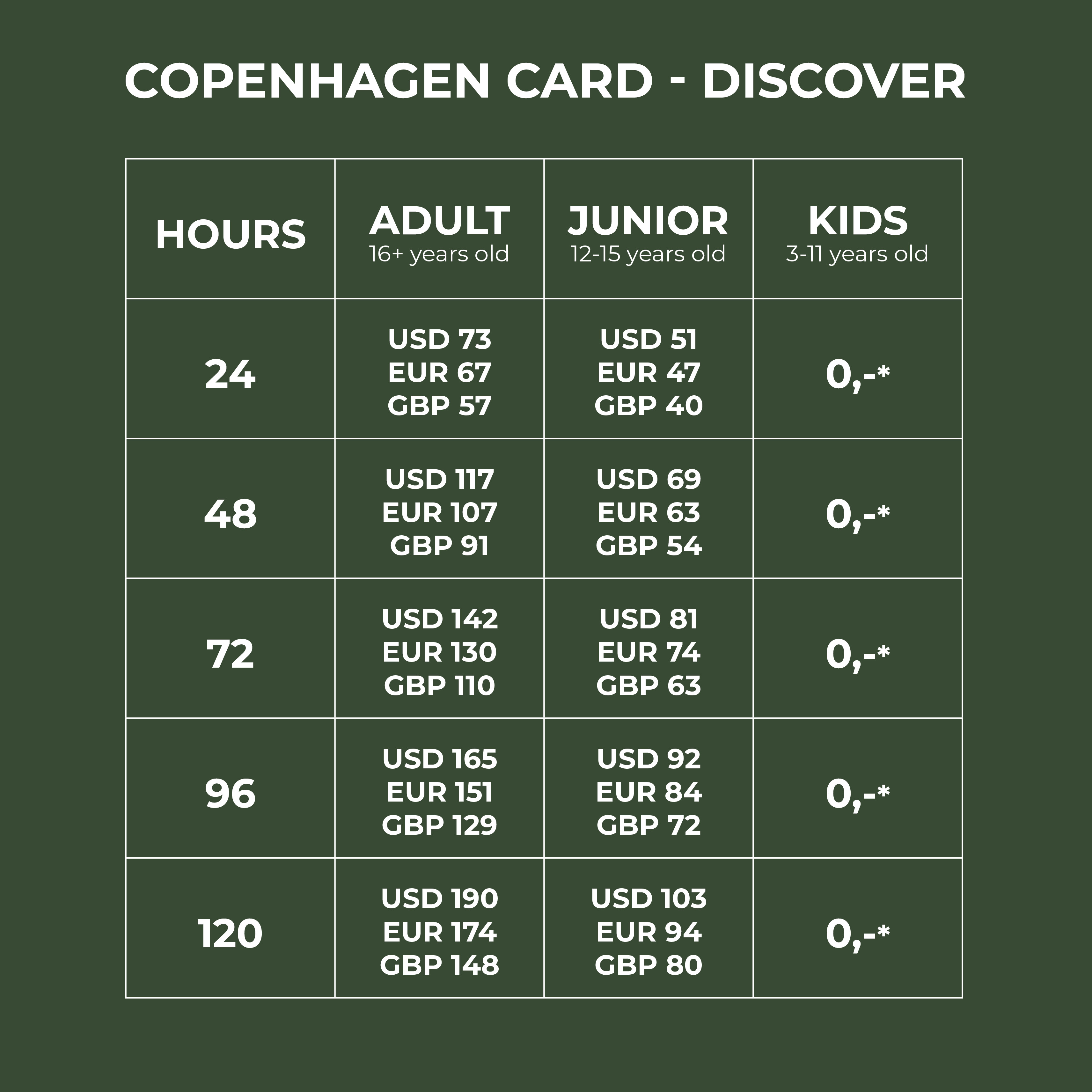 | 24 | DKK 580 EUR 78 GBP 68 USD 91 | DKK 380 EUR 51 GBP 45 USD 60 | 0,-* |